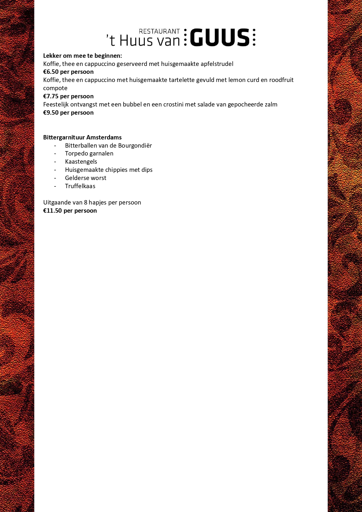 In ’t Huus van Guus bieden we speciale arrangementen aan, waar gasten elke gelegenheid kunnen vieren in sfeervolle aparte ruimtes. Deze kamers zijn afgescheiden van het hoofdrestaurant, waardoor je de mogelijkheid hebt om met gezelschap privé of semi-privé te genieten van een fantastiche lunch, diner of borrel.